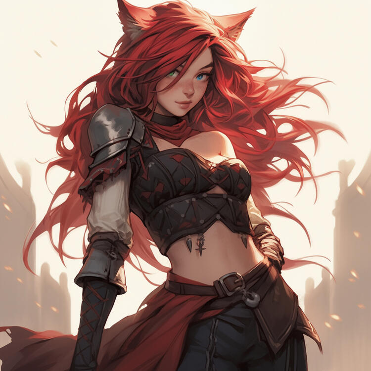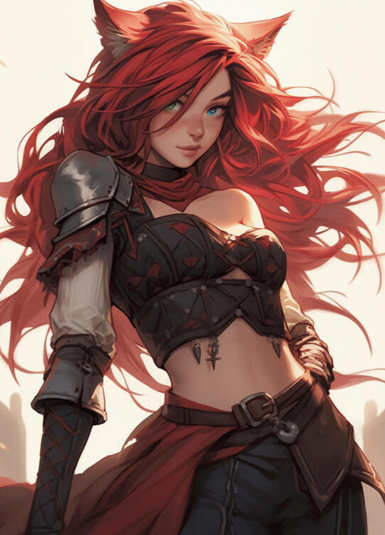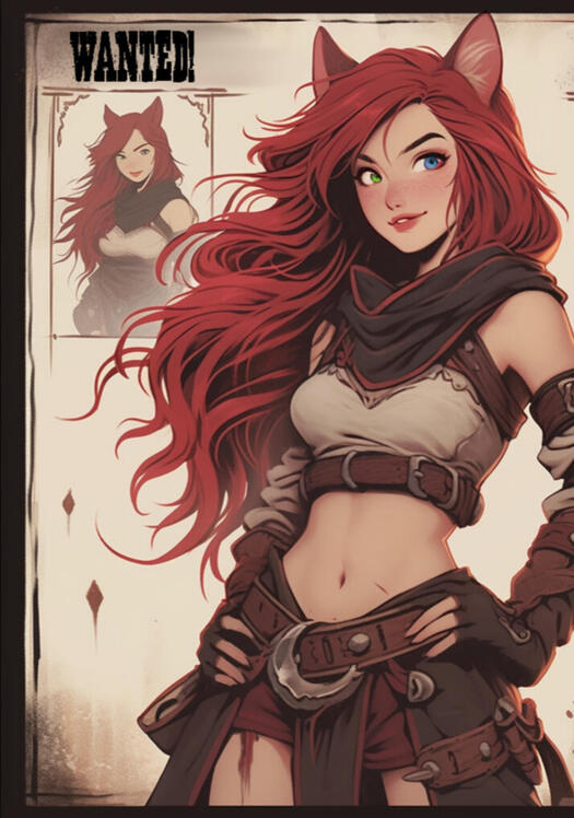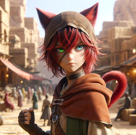 Syndicate Street UrchinUl'dah's sun-scorched streets were O'naryi's jungle, her red hair a desert echo of lost silk. Tragedy plunged her into the Syndicate's iron grip, forcing her nimble fingers, once adorned with jade, to become weapons of silent thievery. Days were a pirouette of dust and danger, nights a refuge in the Syndicate's den, bartering stolen trinkets for fleeting oblivion. The debt, a monstrous sandworm, devoured every gilded coin, but defiance bloomed in O'naryi's heterochromatic eyes, a desert storm brewing in the shadow of her stolen past. She wasn't just a sparrow of the Syndicate, but a daughter of lost fortune, and one day, the winds would shift and she would break free, leaving behind a trail of glittering dust and the whisper of a sparrow who dared to rise against the sun.